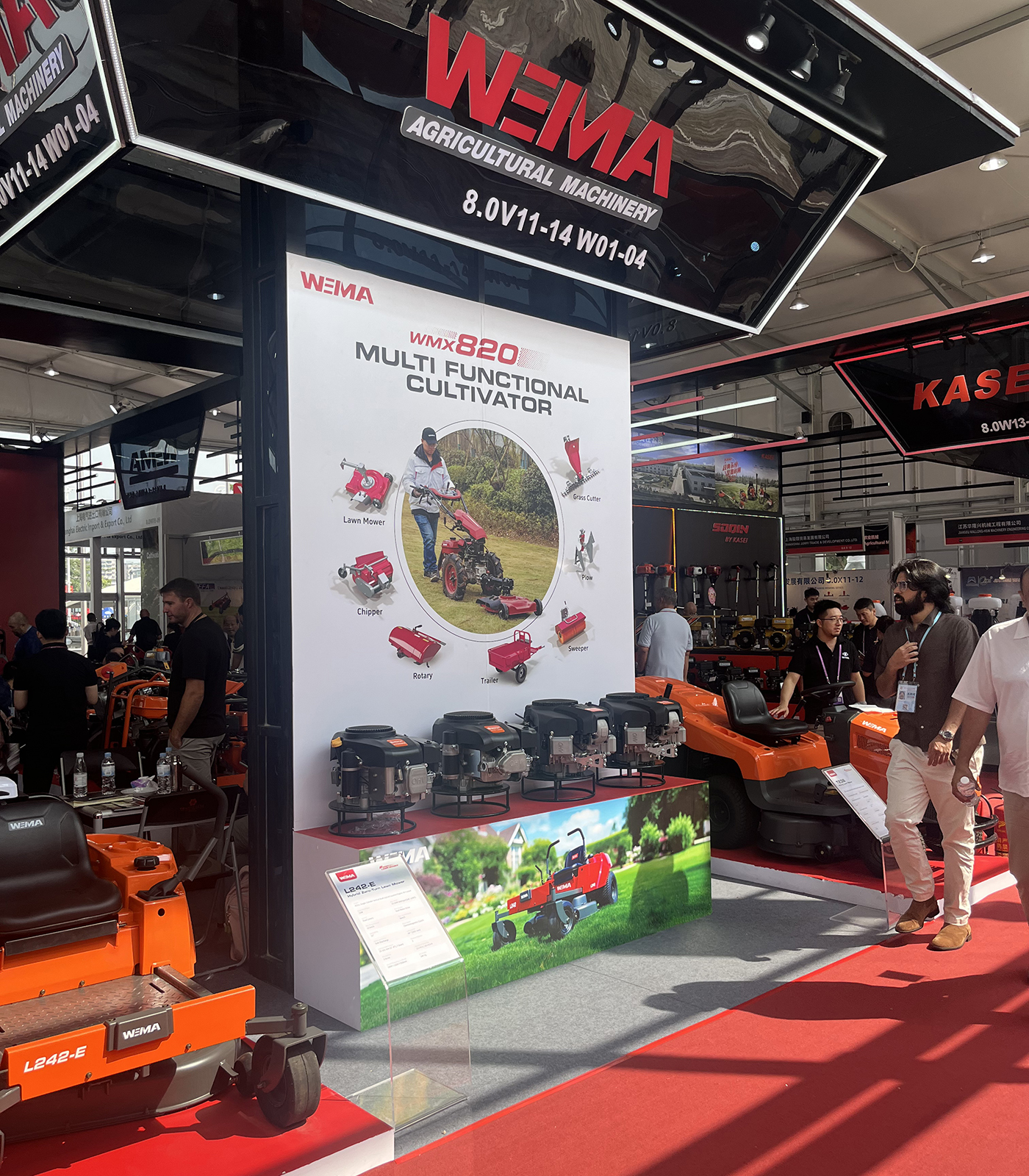 WEIMA品牌展出动力设备、水泵、发电机组、微耕机、坐式旋耕机、田园管理机、碎枝机、碎草机、扫雪机、高压清洗机、平板夯、冲击夯、切割机以及零转向混动割草机等系列产品,构建多系列农业机械和动力机械产品的完整工具链。